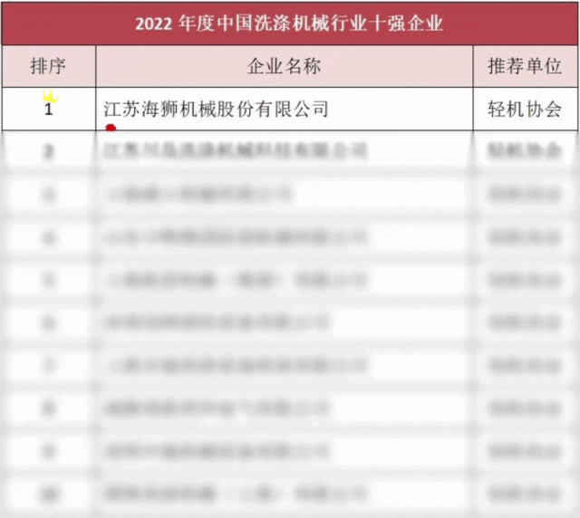 同時,由中國輕工機(jī)械協(xié)會推薦,榮獲2022年度中國洗滌機(jī)械行業(yè)十強(qiáng)企業(yè)中,江蘇海獅機(jī)械榮居榜首,繼續(xù)領(lǐng)跑工業(yè)洗滌機(jī)械行業(yè),展現(xiàn)出54年耕耘工業(yè)洗滌機(jī)械行業(yè)的深厚積淀和卓越成績。