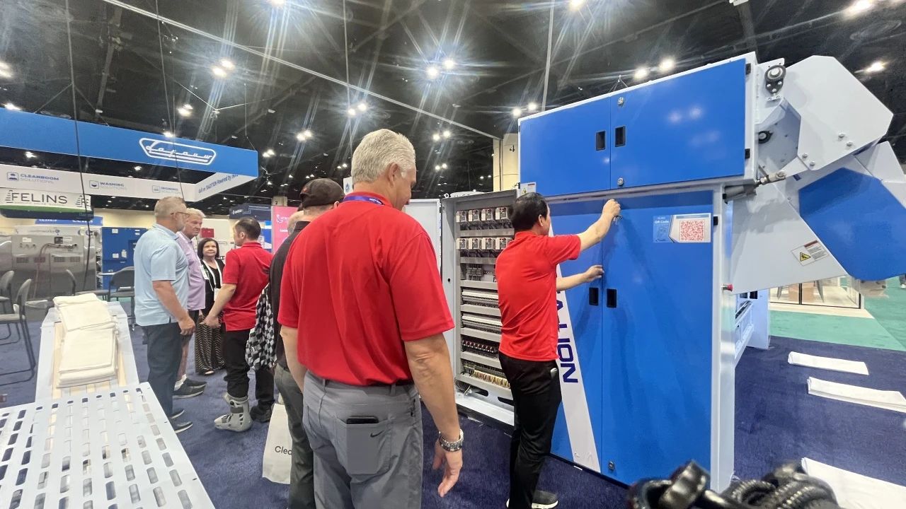 “Titanium”鈦系列洗脫機與烘干機,聚焦高效洗滌與節(jié)能降耗雙重優(yōu)勢。通過精準控溫、智能水循環(huán)系統(tǒng)及變頻電機技術(shù),實現(xiàn)單位時間內(nèi)更高洗滌量和烘干量的同時,大幅降低水、電、蒸汽消耗,為用戶帶來經(jīng)濟與環(huán)保兼具的卓越體驗 參展人士對這一系列設(shè)備表現(xiàn)出了濃厚興趣,在現(xiàn)場海獅人員的詳細操作講解下,他們對中國制造的研發(fā)制造實力有了更深刻的認識,紛紛為海獅機械的創(chuàng)新能力點贊。