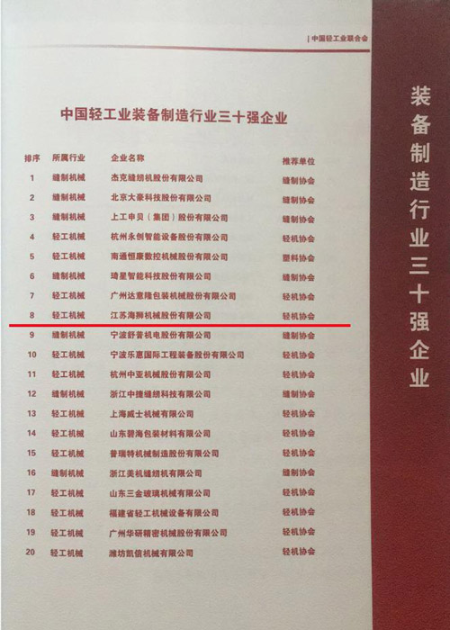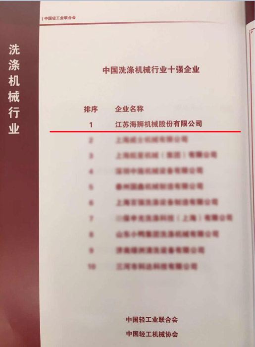 今日江蘇海獅機械股份有限公司榮獲了中國洗滌機械行業(yè)十強首位,中國輕工業(yè)裝備制造行業(yè)三十強企業(yè)第8位,中國輕工業(yè)科技百強企業(yè)第23位